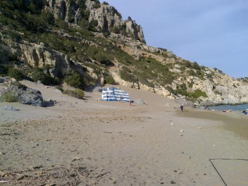 - Die wunderschöne, große Sandbucht von Tsambika liegt direkt neben dem gleichnamigen Klosterberg. Sie ist 2-3 km lang, 40-50 m breit, von Felsenkaps umgeben und eine wahre Traumbucht. Im hinteren Teil der Bucht stehen Bäume und Büsche, das Wasser ist flach abfallend, klar und ohne Seegras.